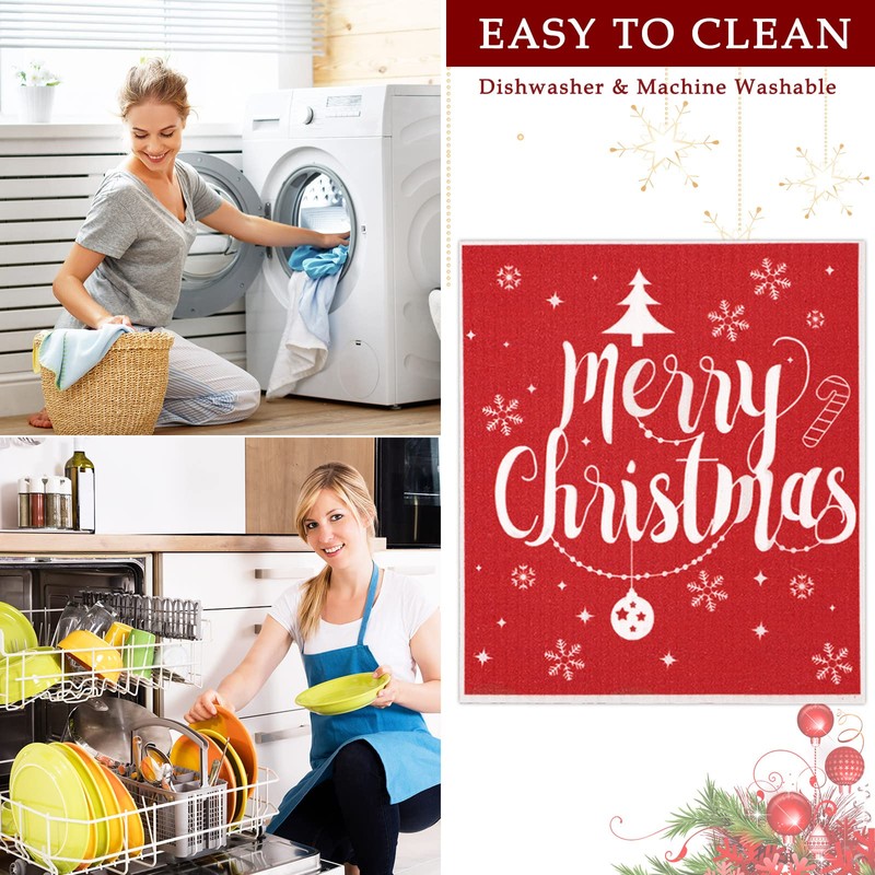 Whaline 6Pcs Christmas Swedish Dishcloths Red White Xmas Tree Snowflake Reindeer Kitchen Dish Towel Reusable for Christmas Winter New Year Baking Cooking, 6.7 x 7.7Inch