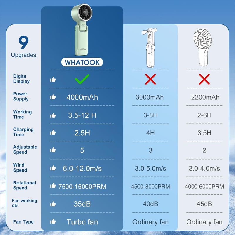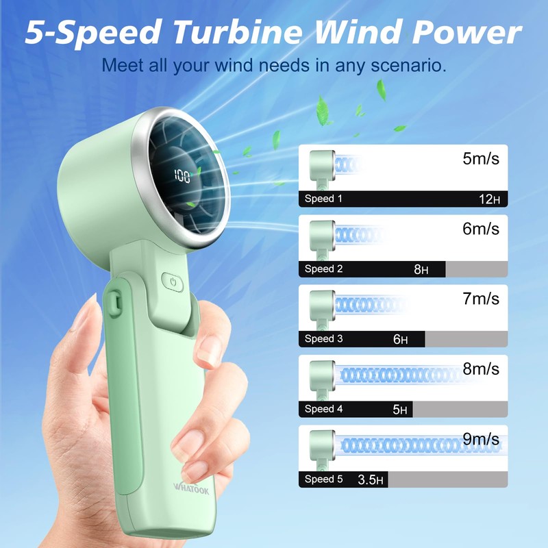 WHATOOK Hand Held Fan Rechargeable Portable:Handheld USB Fans with 5 Speed, 90° Variable Tilt Operated Mini Fan Foldable Desk Desktop Fans with LED Display for Home Office Outdoor Travel, Cyan