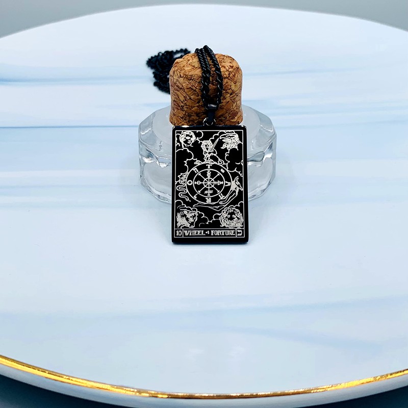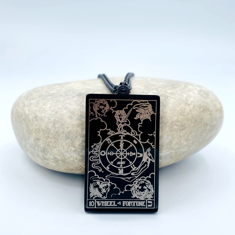 - 'Wheel of Fortune' tarot necklace holds significance for anyone who practices and believe in tarot card readings. Embrace the major arcana necklace and gift it to yourself or to someone who believes in tarot. A perfect birthday gift for all, this 'Wheel of Fortune' tarot necklace will swing in delight and swag in pride.