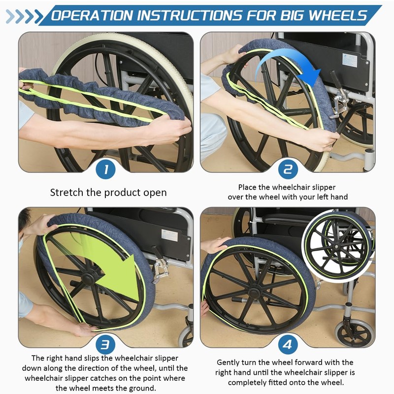 EHUELDER wheelchair wheel covers assist users in addressing the awkwardness and cleanliness issues when transitioning from outdoors to indoors. By utilizing these wheelchair slippers, one can prevent the floor from being soiled with dirt and debris brought in from outside, as well as ensure the floor remains free from the rubber marks left by wheelchair wheels. The wheelchair slippers features a plush material similar to carpet, which is soft, durable, and of moderate thickness, ensuring it does not impede the movement of the wheelchair. EHUELDER wheelchair slippers come in multiple size options, with the dimensions for front and rear wheel guards as follows: Front wheels of the wheelchair: 6 Inches wheel cover---1 Pair per package(without Storage bag) 8 Inches wheel cover---1 Pair per package(without Storage bag) Rear wheels of the wheelchair: 20 Inches wheel cover---1 Pair per package(with Storage bag) 22 Inches wheel cover---1 Pair per package(with Storage bag) 24 Inches wheel cover---1 Pair per package(with Storage bag) 【Clean Tips】EHUELDER wheelchair protector cover is machine-washable.It is recommended to place the wheel cover properly in a dedicated laundry bag before washing it in the washing machine. This not only better protects the product, reducing the pilling caused by friction, but also effectively extends the product's lifespan.