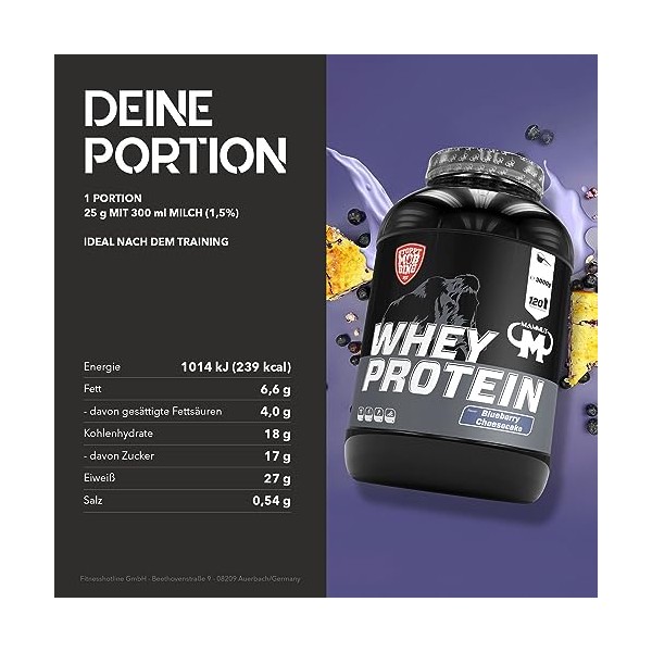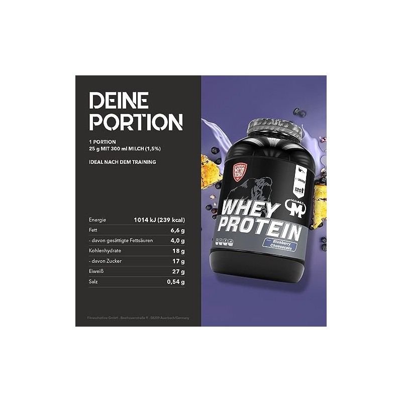 Wichtige Hinweise: Eine abwechslungsreiche, ausgewogene Ernährung und eine gesunde Lebensweise sind wichtig für die Gesundheit. Hergestellt in Deutschland. Besonders für Sportler geeignet. Maximal 1 Portion pro Tag. Herkunft Primärzutat EU: Molkenproteinkonzentrat.