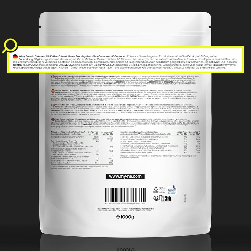 Whey Protein Powder - Iced Coffee - 1 kg - 23 g Protein and 2.5 g Coffee Extract per Serving - for Your Muscle Building, High Dose - Produced and Laboratory Tested in Germany