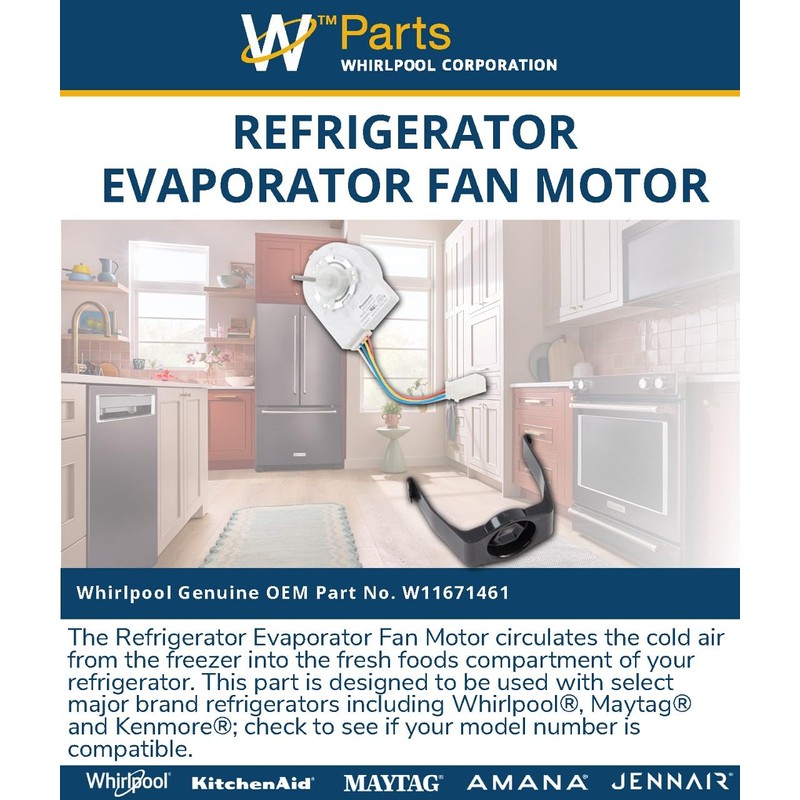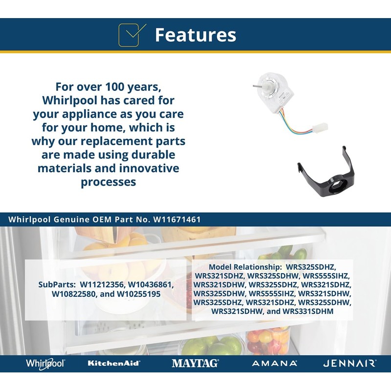 - REPLACEMENT PART NUMBERS: W11671461 Refrigerator Evaporator Fan Motor replaces the part numbers W11212356, W10436861, W10822580, and W10255195