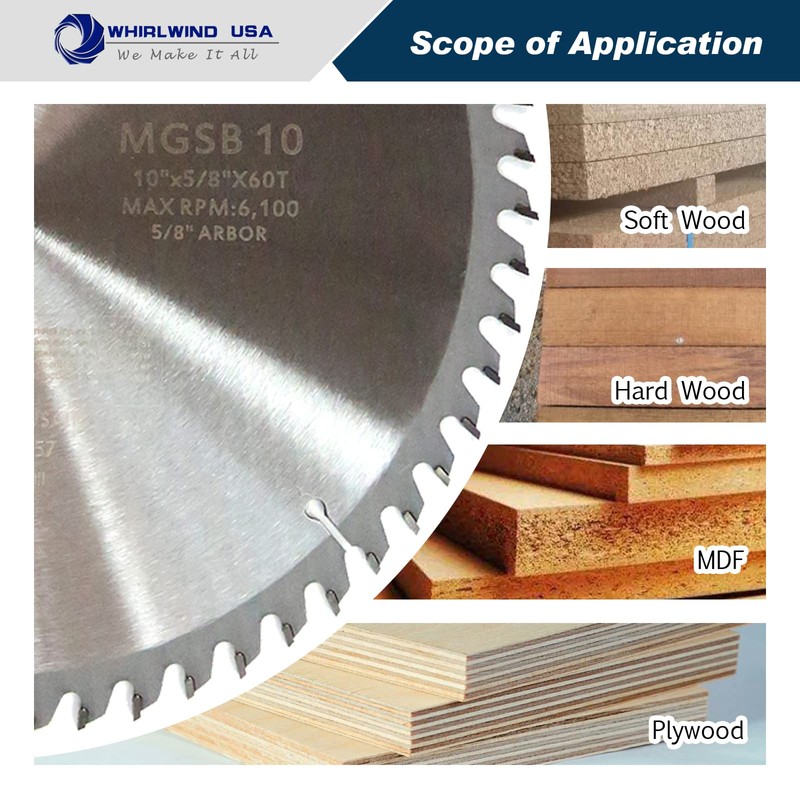 Whirlwind USA MGSB 10 Inch 60 Teeth Circular Saw Blade for Wood,Carbide Cordless Miter/Table Saw Blade,5/8" Arbor