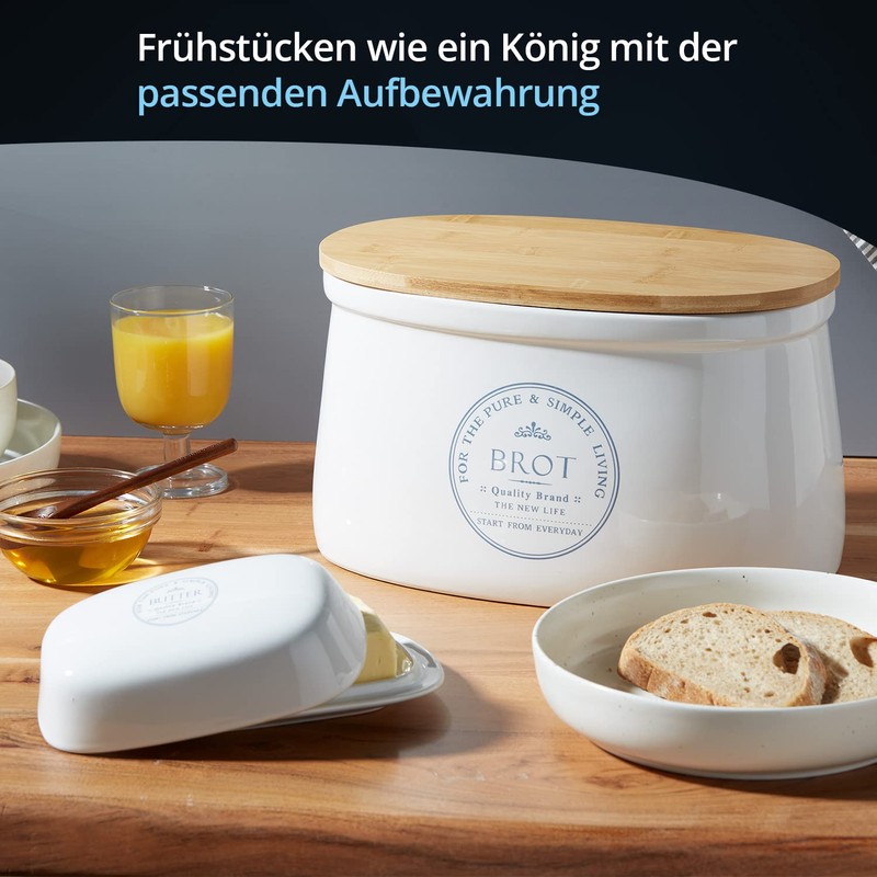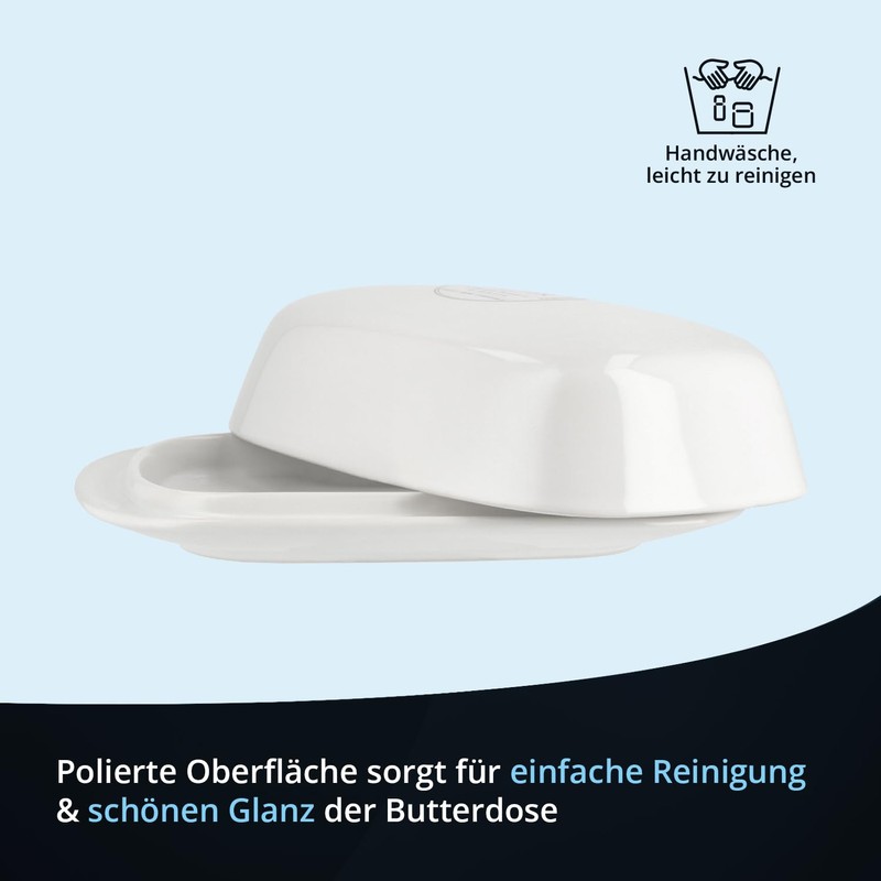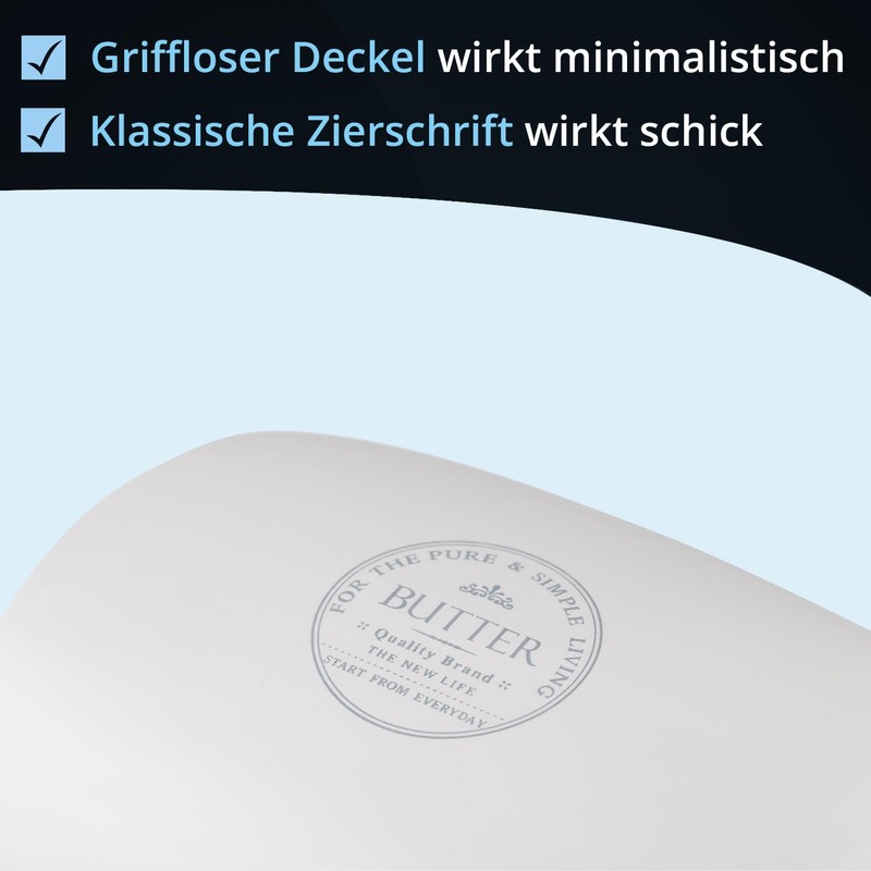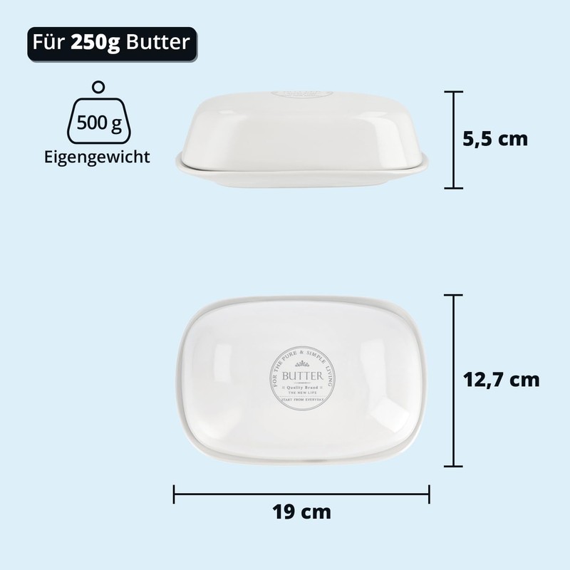 • Dimensions: The butter dish from KHG has a height of 5.5 cm, a length of 19 cm and a width of 12.7 cm. This makes the butter dish ideal for storing a classic butter block of 250 g.