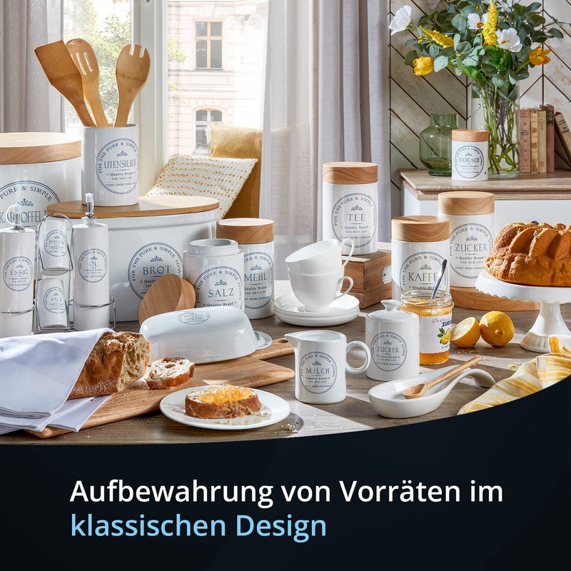 Do you like cooking and are looking for an attractive storage system for your ingredients? Then you will surely like these kitchen utensils from KHG well. The nostalgic tins are a real eye-catcher. Their detailed lettering is reminiscent of goods labels from times gone by. The body stands in an attractive contrast to the light colour of the wooden lid. With this elegant look, the storage jar fits perfectly into your kitchen, whether country house or Mediterranean style. Each container offers plenty of space for different foods. While the coffee tin can be sealed airtight, the containers for potatoes, onions and garlic allow good ventilation via small inlets. This maximises durability. As a material, the manufacturer KHG has chosen high-quality stoneware. Complete the storage containers with other, perfectly coordinated items from the series. So everything fits perfectly together and your kitchen looks bright and well sorted.