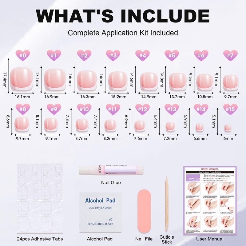 - Complete Toenail Kit: Includes 32 nails in 16 sizes for a custom fit, plus nail glue, adhesive tabs, double-sided file, cuticle stick, prep pads, and a user manual—everything you need for a professional at-home manicure.