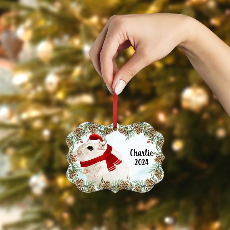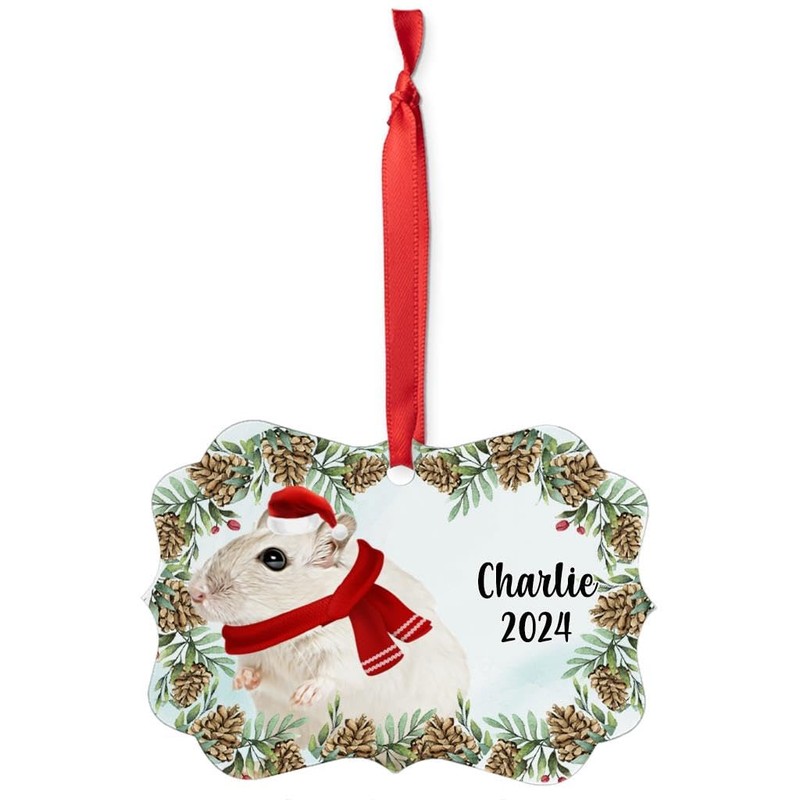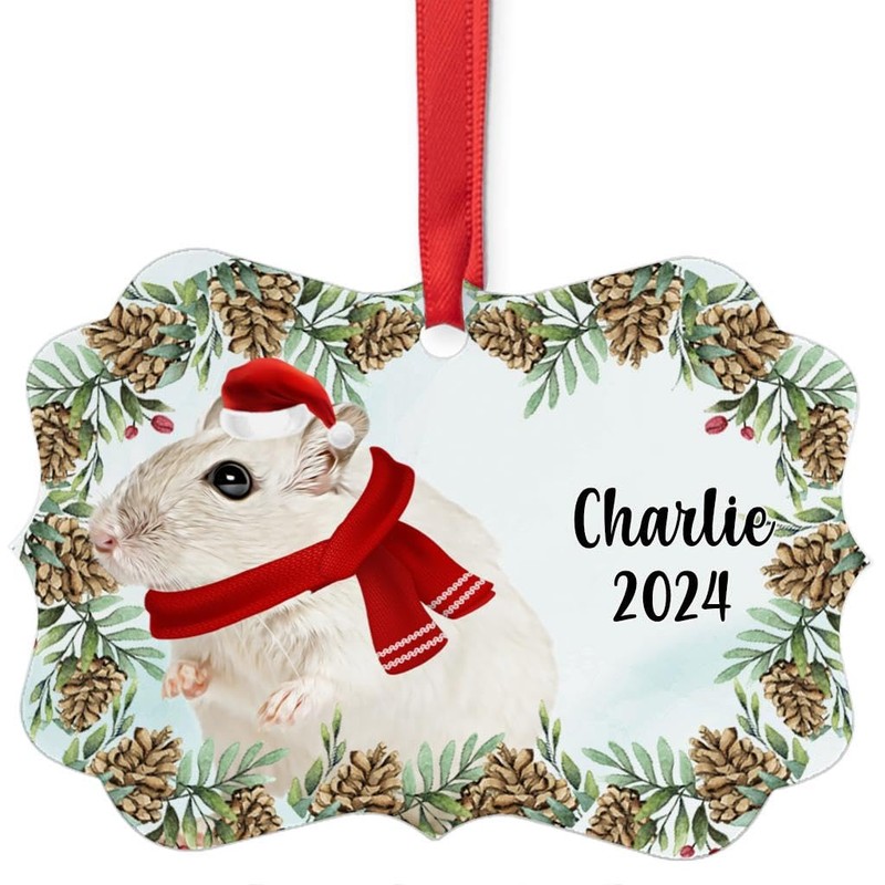 White Hamster Christmas Ornament 2025 - Personalized Aluminum Pinecone with Red Scarf and Santa Hat - Gifts for Hamster Lovers