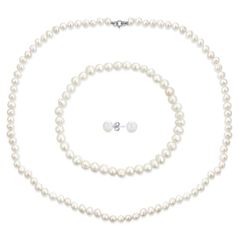 - Classic traditional and timeless cultured pearls set The delicate 6mm freshwater stud earrings, white pearl stretch bracelet and the bridal pearl necklace that make up this affordable jewelry set. If you are planning a wedding, consider this pearl jewelry set as a bridesmaids gift