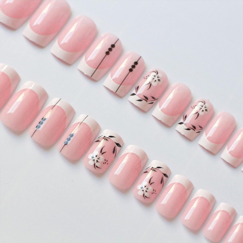 White Press on Nails Medium French Tip Fake Nails Flowers & Leaves Glue on Nails Light Pink Translucent Acrylic Nails Black Lines Stick on Nails for Women 24 Pcs