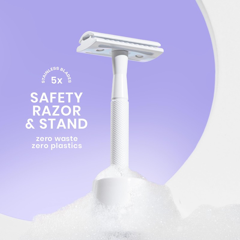 Reusable Safety Razor – Crisp White Finish | Includes Stand + 5 Blades | Metal Razor for All Genders