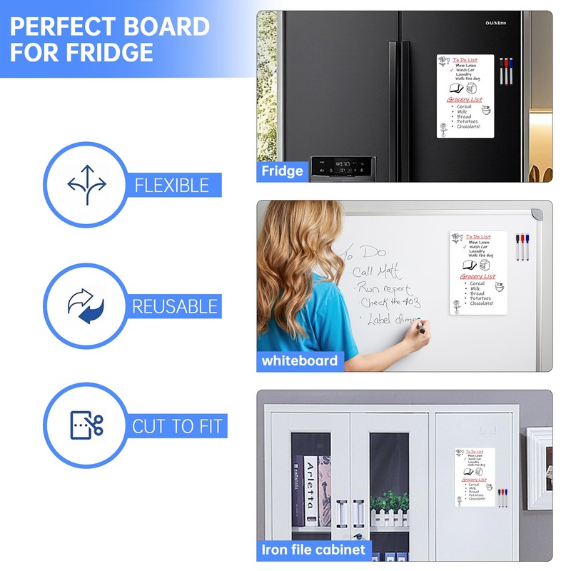 - All Magnetic: The magnetic whiteboard kit includes 1 magnetic whiteboard and 3 high-quality magnetic marker pens. The accessories will always stay attached to your refrigerator whiteboard, ensuring that you never lose them.