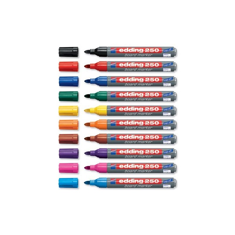 edding 250 Whiteboard Marker. Dry wipe off almost all closed surfaces such as emalie, glass, melamine. Low odour alcohol-based ink. Can be left for a few days without drying out thanks to the "cap-off" inks. Bullet tip, interchangeable tip. Aluminium shaft. Cap can be changed into ink colour.