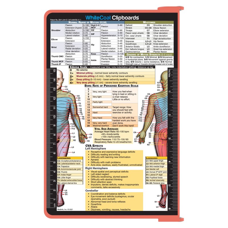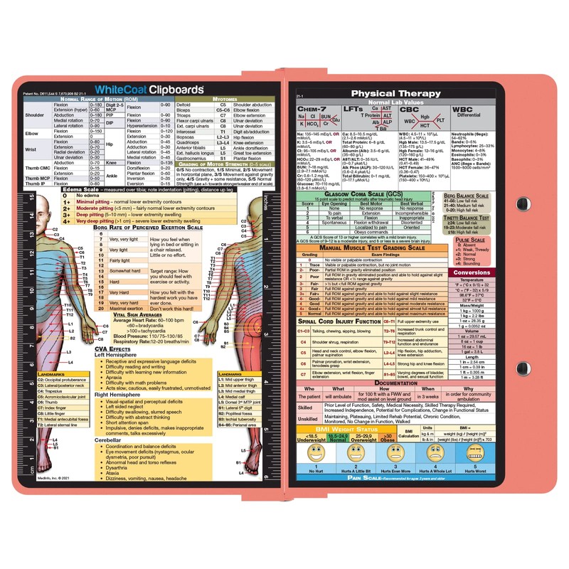 This is one-of-a-kind patented full size folding clipboard made of lightweight aluminum designed for Physical Therapists containing the most daily referenced medical information. WhiteCoat Clipboards are used by physicians, interns, residents, nurses, or any healthcare professional needing a solid writing surface and the ability to conceal documents (HIPAA compliant). Our unique patent folding design allows the clipboard to fold in half for easy storage and carrying up to 30 pieces of paper without creasing your documents. Hover over the above image to see details views of the physical therapy information contained on this clipboard. Our Physical Therapy label includes information on the Modified Ashworth Scale, Rancho Los Amigos Scale, and Level of Assist on the inside of the clipboard.