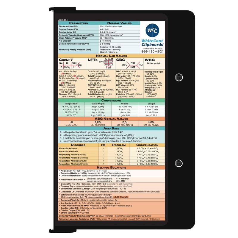 Full size medical pocket clipboard from WhiteCoat Clipboard. Unique design allows the clipboard to fold in half for storage in your pocket. Made of lightweight aluminum with the ability to carry 15 pieces of paper without a crease, while at the same time securing all your medical information inside. Carry extra history and physical exam forms, SOAP notes or progress note pages without worry of losing your data. The clipboard also functions as a quick medical reference guide with detailed day-to-day information such as EKG interpretation, acid/base determination, lab values and much more.