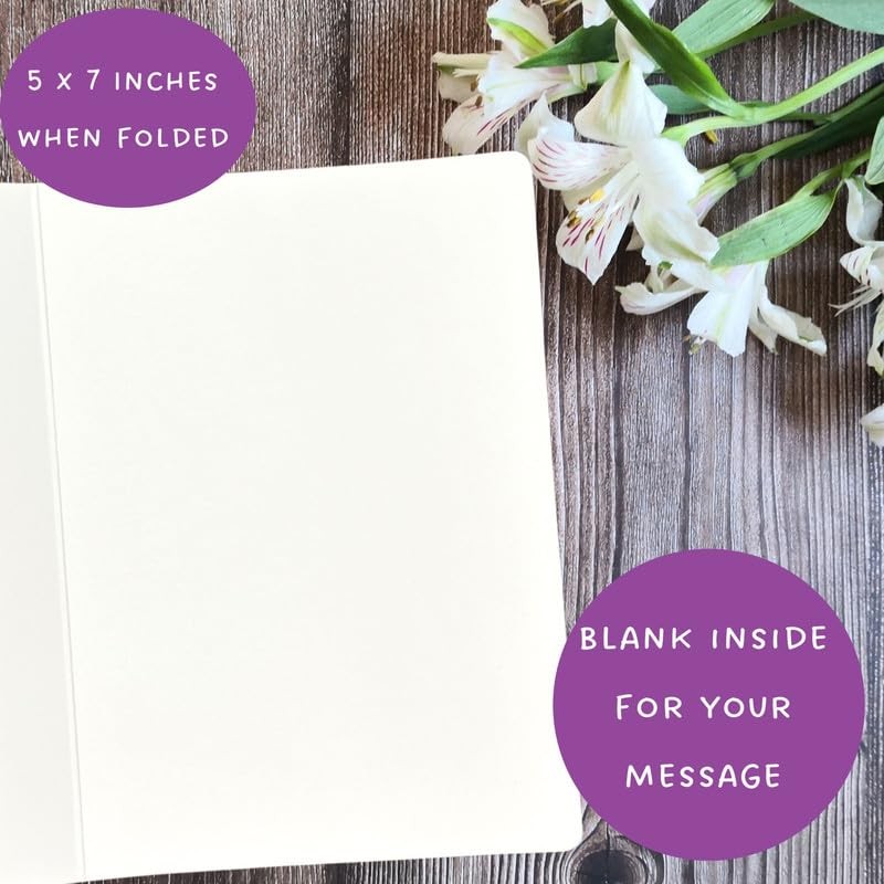 - The greeting card measures 5 by 7 inches when folded and is designed and printed in the USA on very thick white paper that feels important and its matte finish is smooth enough for easy writing. Each note card comes with one premium kraft colored greeting card envelope.