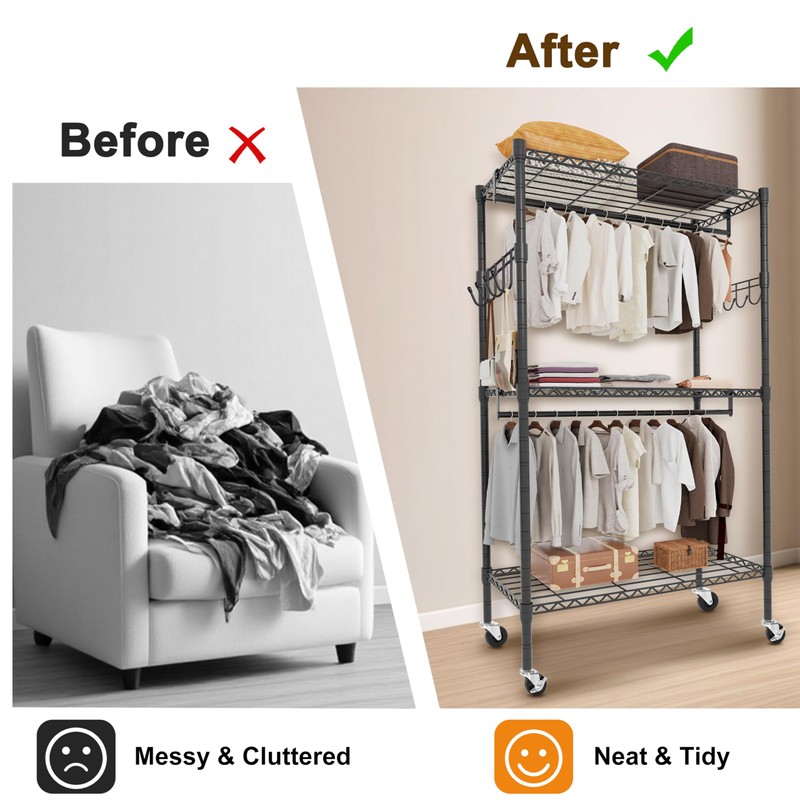 - Versatile Applications: The heavy duty wardrobe rack is perfect for organizing clothes, scarves, hats, bags, and shoes in bedrooms, living rooms, or hallways. The rolling garment rack helps transform cluttered spaces into neat and orderly areas.