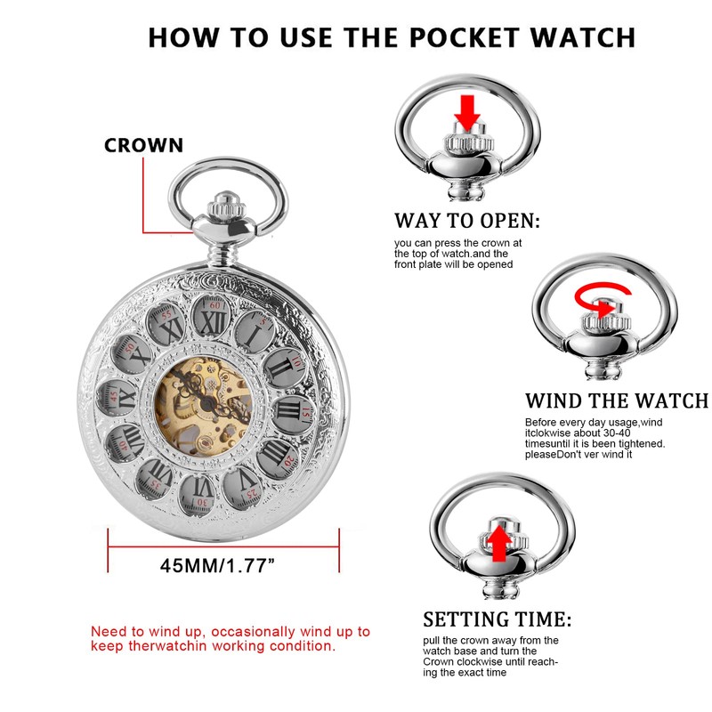 - Package includes: 1 x pocket watch, 1 x chain, 1 x operating instructions, 1 x black gift box.