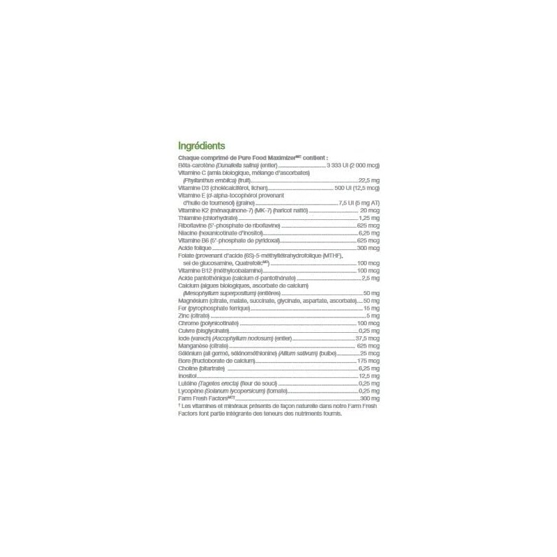 Each Pure Food MaximizerTM tablet contains: Beta-carotene (Dunaliella salina) (whole) 3333 IU (2000 mcg) Vitamin C (organic amla (Phyllanthus emblica) (fruit), mixed ascorbates) 22.5 mg Vitamin D3 (cholecalciferol, lichen) 500 IU (12.5 mcg) Vitamin E (d-alpha tocopherol from sunflower oil) (seed) 7.5 IU (5 mg AT) Vitamin K2 (menaquinone-7) (MK-7) (natto bean) 20 mcg Thiamine (hydrochloride) 1.25 mg Riboflavin (5’-phosphate sodium) 625 mcg Niacin (inositol hexanicotinate) 6.25 mg Vitamin B6 (pyridoxal 5’-phosphate) 625 mcg Folate (from (6S)-5-methyltetrahydrofolate acid (MTHF), glucosamine salt, Quatrefolic®) 350 mcg Vitamin B12 (methylcobalamin) 100 mcg Pantothenic acid (calcium d-pantothenate)2.5 mg Calcium (organic algae (Mesophyllum superpositum) (whole), calcium ascorbate)50 mg Magnesium (citrate, malate, succinate, glycinate, aspartate, ascorbate) 50 mg Iron (ferric pyrophosphate) 15 mg Zinc (citrate) 5 mg Chromium (polynicotinate)100 mcg Copper (bisglycinate) 0.25 mg Iodine (kelp) (Ascophyllum nodosum) (whole) 37.5 mcg Manganese (citrate)625 mcg Selenium (sprouted garlic (Allium sativum) (bulb), selenomethionine) 25 mcg Boron (calcium fructoborate) 175 mcg Choline (bitartrate) 6.25 mg Inositol (inositol, inositol hexanicotinate) 12.5 mg Lutein (Tagetes erecta) (marigold flower) 0.25 mg Lycopene (Solanum lycopersicum) (tomato fruit) 0.25 mg Farm Fresh FactorsTM† 100 mg