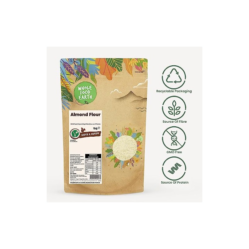 Product DescriptionBlanching removes the skin from the almond, resulting in a skinless, white almond with less bitter properties. The peeled almonds are then cut into flakes, which are recognised for their sweetness and, more precisely, their peculiar "Marzipan" flavour. It should come as no surprise that Almond flour is particularly well suited to baking and confectionary due to its creamy flavour. It's fantastic for thickening smoothies or adding nutritious sweetness to your breakfast cereal! Almonds include two essential fatty acids that aid in the reduction of harmful cholesterol levels and the promotion of good skin and hair. Finally, almonds include two essential brain nutrients that are typically difficult to obtain from other foods. Almond eating is a highly suggested method of boosting your intake of essential brain nutrients. GMO-free Ground Almonds are suitable for Vegans. We believe that good food shouldn't cost the earth, as such, sustainability matters to us dearly. That's why we work tirelessly to find sustainable solutions throughout our business. We rolled out all-new 100% recyclable packaging on Wholefood Earth products. The new packaging is apt for kerbside recycling. Thank you for knowing It's what's on the inside that counts. For wanting a future without toxins in the food your children eat. For insisting on the accountability that traces food back to its source. For protecting the biodiversity that nurtures animal habitats and makes crops thrive. And, from everyone here at Wholefood Earth, thank you for using your buying power to make meaningful, informed choices that will continue to nourish our people and our planet today, tomorrow, and forever. We're here for a healthier earth, sustainable earth, wholesome earth.IngredientsGround Almonds.DirectionsSuitable for Vegan & Vegetarians. Read labels for any allergen advise prior to use. May contain other nuts, peanuts, sesame seed, other cereals containing gluten & soyaManufacturer Contact InformationWholefood Earth Ltd. 22 Leigh Road, Haine Industrial Estate, Ramsgate, Kent CT12 5EU, United Kingdom