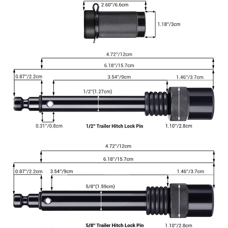 3). Trailer Hitch Lock come with 1/2" and 5/8" hitch pin lock set for Class I, Class II, Class III, Class IV, and Class V Receivers - 1.25" X 1.25", 2" x 2", and 2.5" x 2.5" Receivers