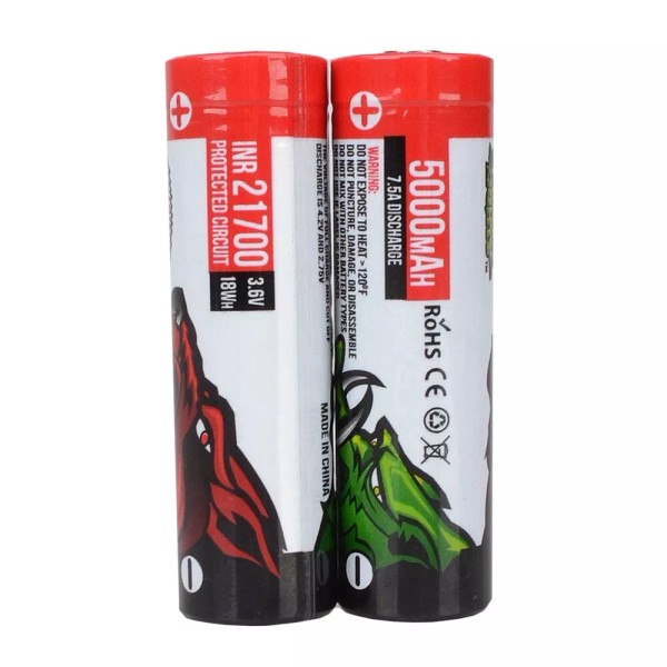 Includes two (2ea) rechargeable button top Lithium Ion PCB (protected circuit) 21700 batteries rated at 5000 mAh and handy storage case.