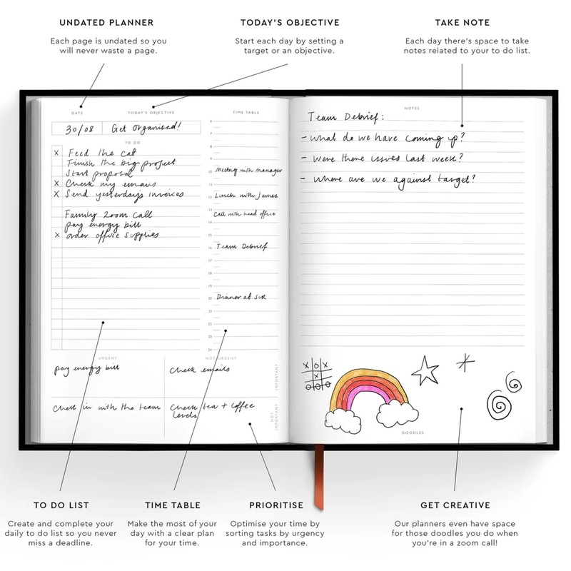 • Additionally, the diary includes dedicated sections for doddling, notes, timetable and objectives with ease.