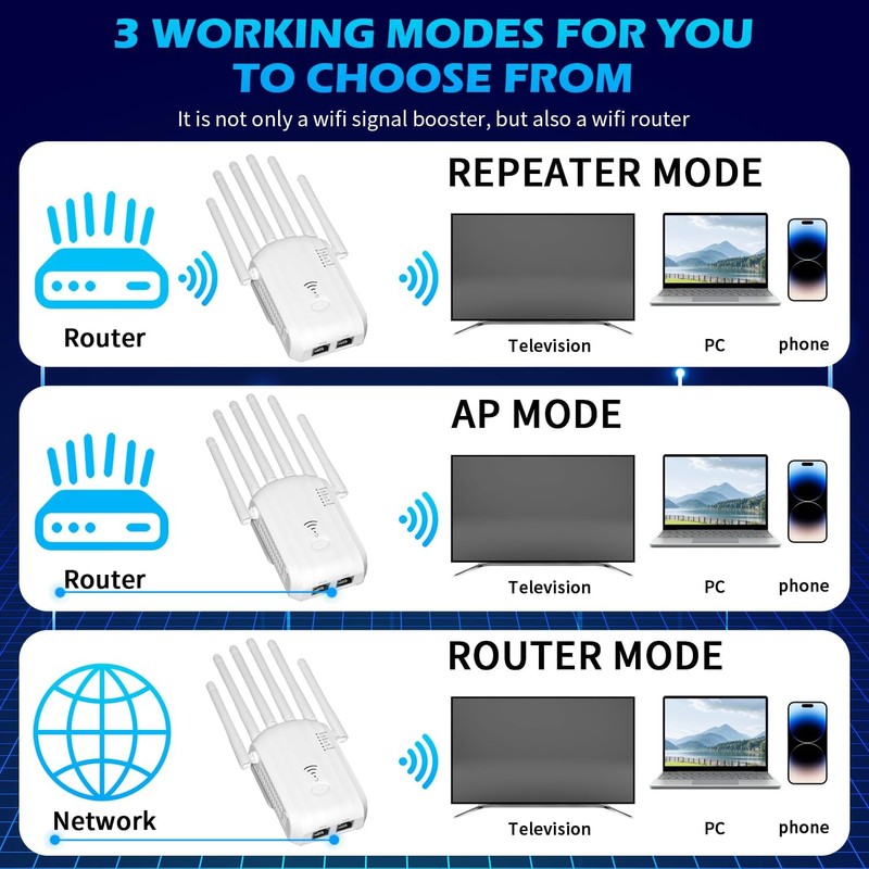 3 Access Point Working Mode: This wifi range extender is equipped with wifi repeater, AP mode, and Ethernet port to suit various networking needs. Repeater Mode is for extending WiFi coverage of an existing wireless network. AP Mode is for covering a wired network to a wireless network. The two Ethernet ports and 6 External Antennas to achieve the best performance, being able to connect to any wired Ethernet device such as smart TV, desktop and so on while boosting your existing WiFi coverage. (WiFi 2.4&5GHz Dual Band WPS, WiFi Signal Strong Penetrability).