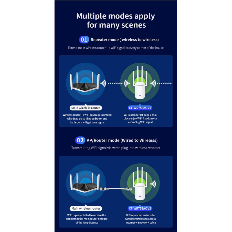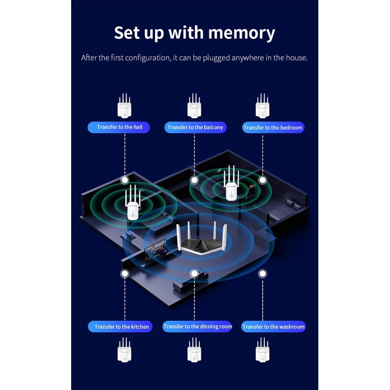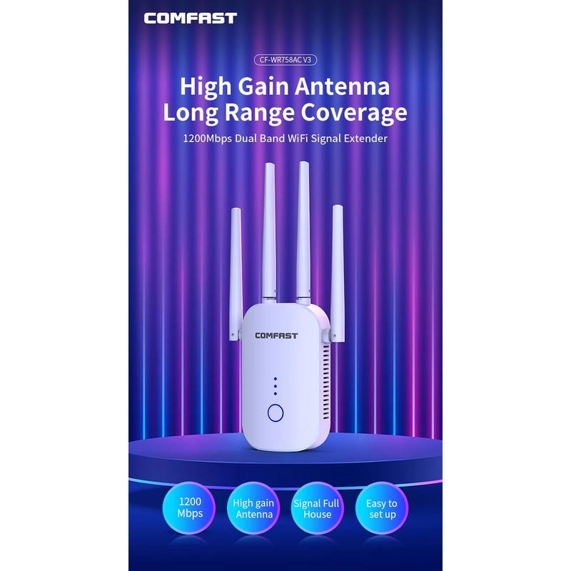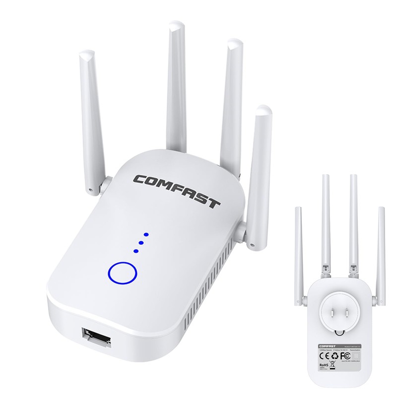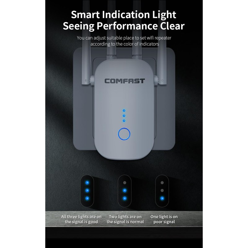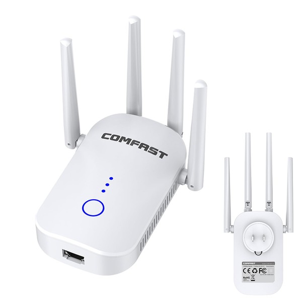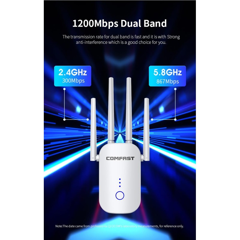 WiFi Extender Signal Enhancer Dual Band 5.8GHz/2.4GHz 1200MMbps Rotating High Gain Four Antennas, Intelligent Signal Light, Supporting Relay/Routing/AP/Bridging Multi-Mode.