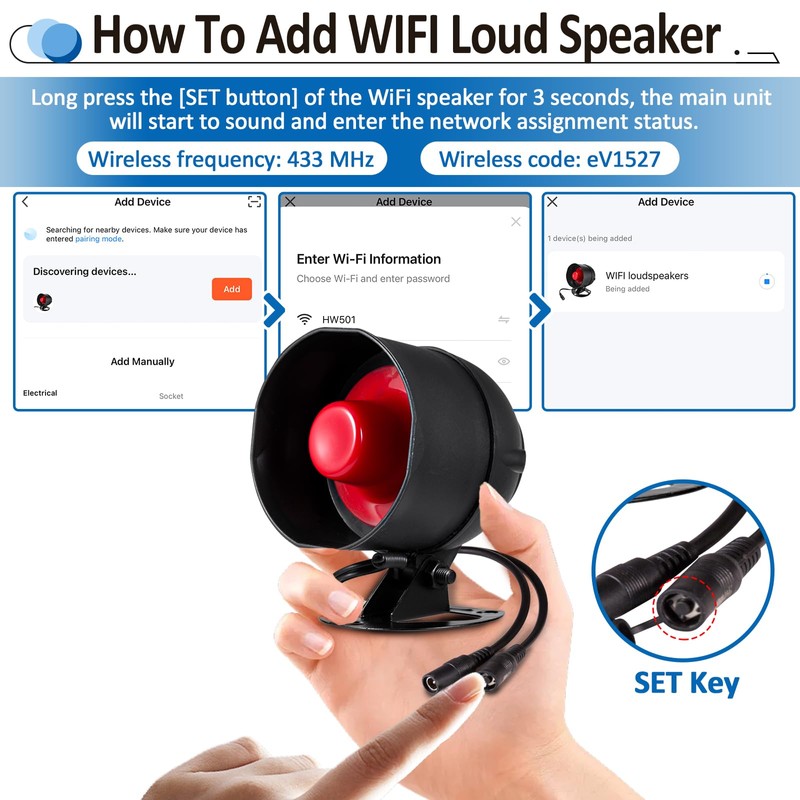 • DIY WiFi Security System:The WiFi speaker supports up to 50 remote controls and 50 sensors with a wireless frequency of 433 MHz, wireless code: eV1527. such as motion sensors, water leakage sensors, smoke sensors, etc., which can extend your security system easily and quickly.