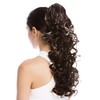 - Voluminously curled ponytail fixed with 2 combs and drawstring just behind the ribbon holding your own hair in a pigtail. Despite the length and volume this hairpiece feels incredibly light. Available in various colours - this in an earthen brown mixed with blond highlights and tips.