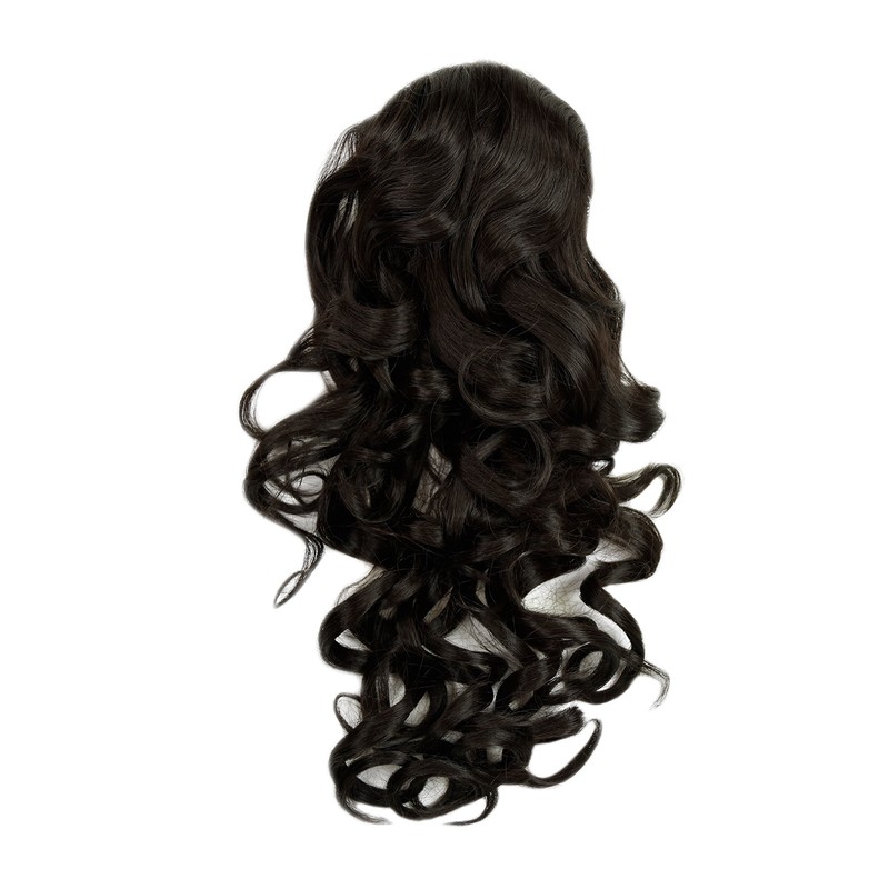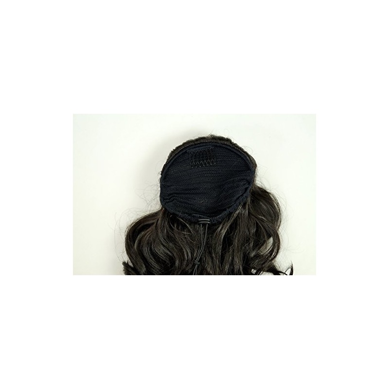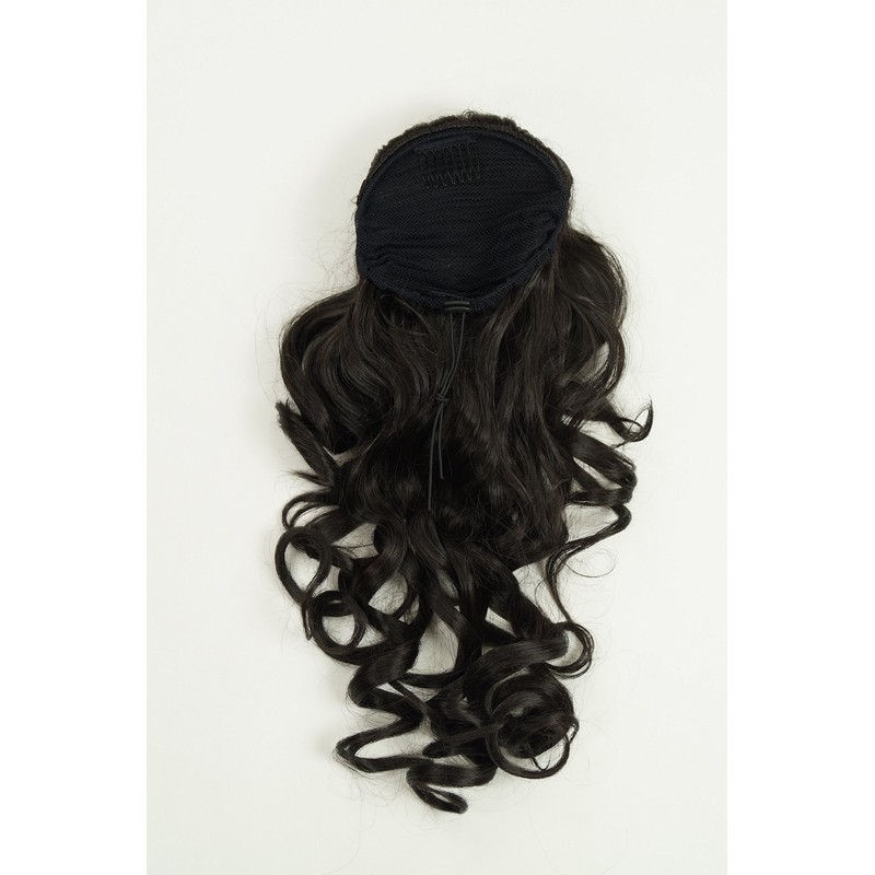 - Dark brown, voluminous, magnificently curly hairpiece made of high-quality synthetic fibre, which is attached to your own hair with a system of two combs and elastic pull. The hair extension sits securely and attaches directly to the back of the head.