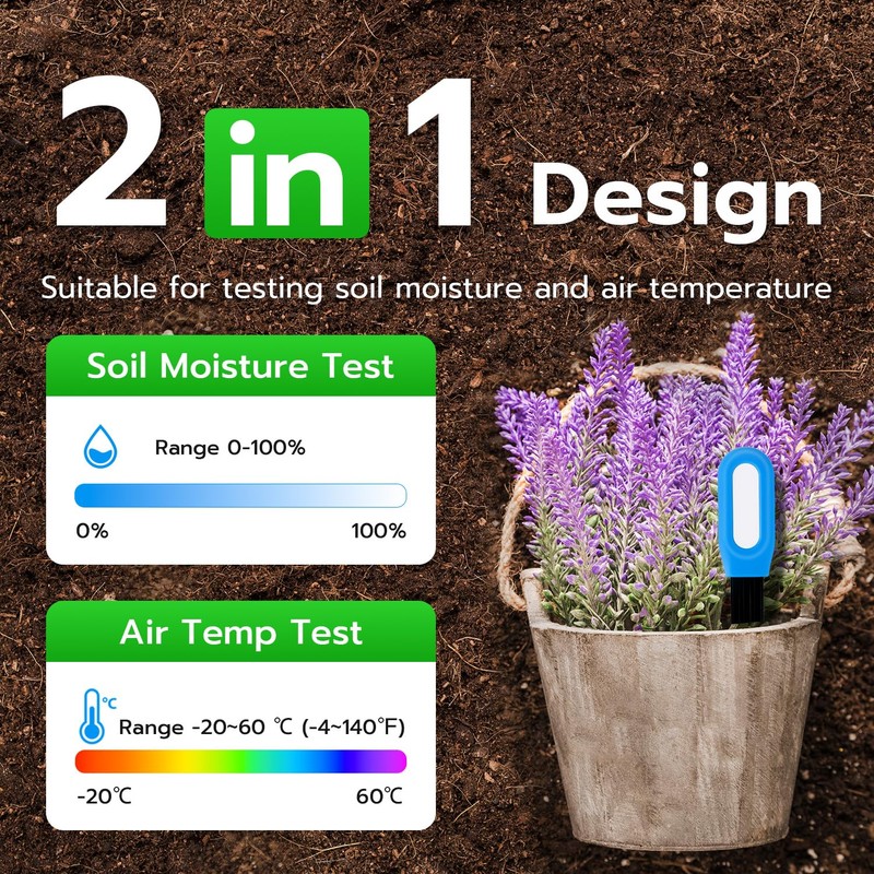 Test Range This product measures soil moisture and air temperature. The measuring range of soil moisture ranges from 0-100%, and the measuring range of air temperature ranges from -20℃ to 60℃.