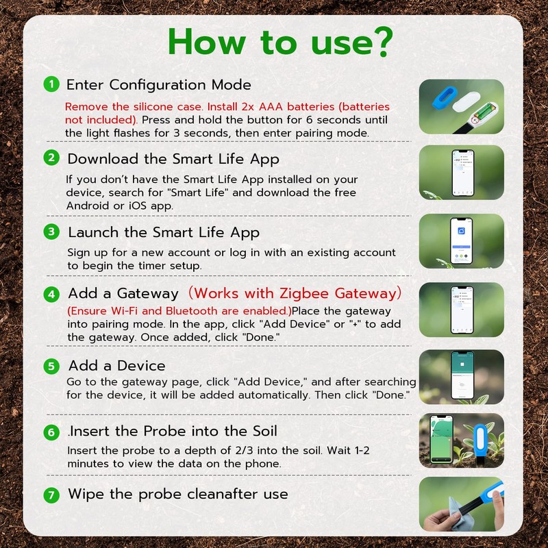 - Easy to use: add the product in the "Smart Life" app on your phone, insert the soil moisture sensor into the soil, and wait 1-2 minutes to see the test results.