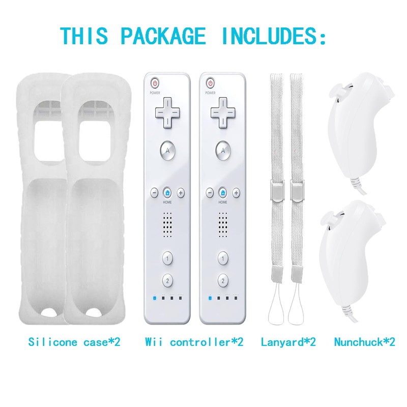 - 【What You Get】Wii Controller x2;Wii Nunchuck x2;Silicone Case x2;Wrist Strap x2. Best gift for boys girls. Especialy holidays,Children's day,birthday and Christmas.If there is any questions about our products before or after sale, please feel free to contact us! We will respond you at the first time, your satisfaction is our biggest goal.
