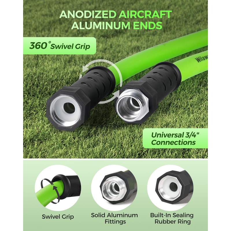 • 360° Swivel Grip: This flexible water hose features a 360° swivel handle that facilitates easy connection and removal from the faucet without having to twisting the entire hose. The even threads and built-in O-ring rubber seals ensure a tight connection and prevent water leakage