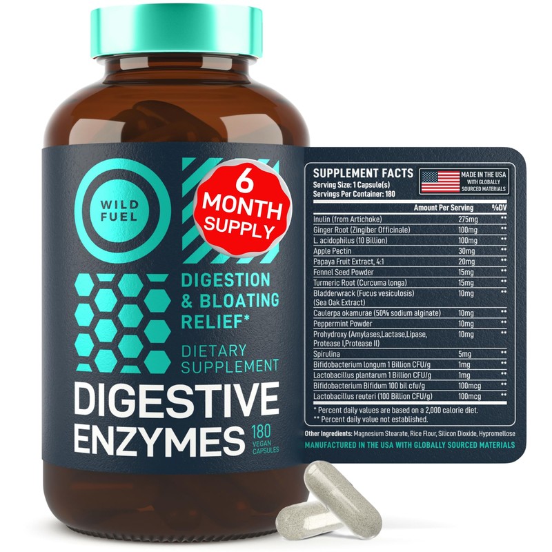 WILD FUEL Digestive Enzymes with Probiotics and Prebiotics - Gut Health, Digestion IBS Supplement with Artichoke Ginger Turmeric – Vegan Probiotic Enzymes Digestive Health and Bloating Relief - 180 Caps
