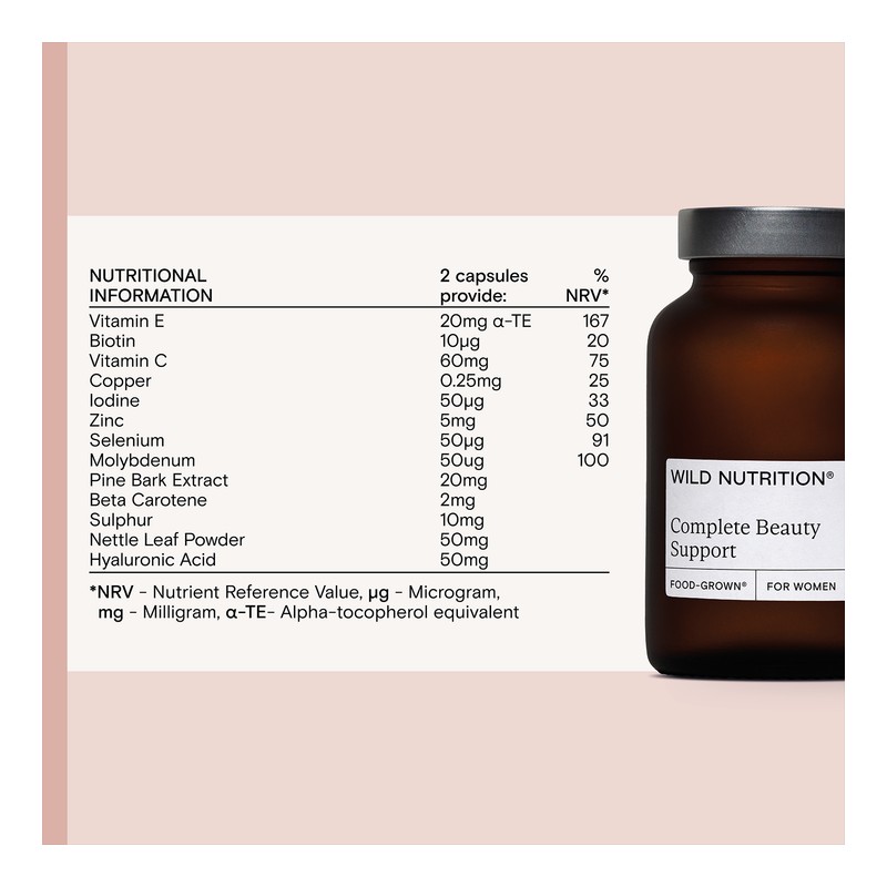 "WHY WILD NUTRITION?" In 2013, with over a decade’s experience running women’s health clinics, nutritional therapist Henrietta Norton felt the supplement industry could serve women better. And so, Wild Nutrition was born. Fast forward to today and Henrietta’s Food-Grown® formulations are loved by women across the globe, at all life stages from puberty to post menopause. Certified B Corp in 2021, Wild Nutrition are the experts in women’s nutritional health." Contains Vitamin C which contributes to normal collagen formation for the normal function of skin