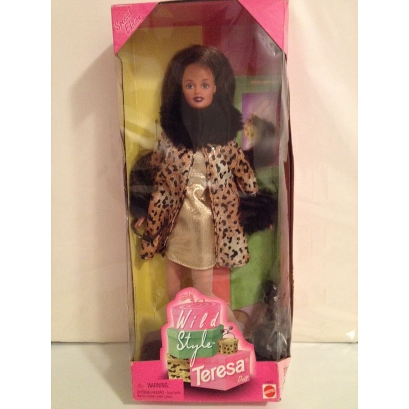 - Barbie Teresa Wild Style Doll has brunette hair and pony, wears a shimmering gold overcoat short dress with leopard prints and fur collar edging on neck and wrists.