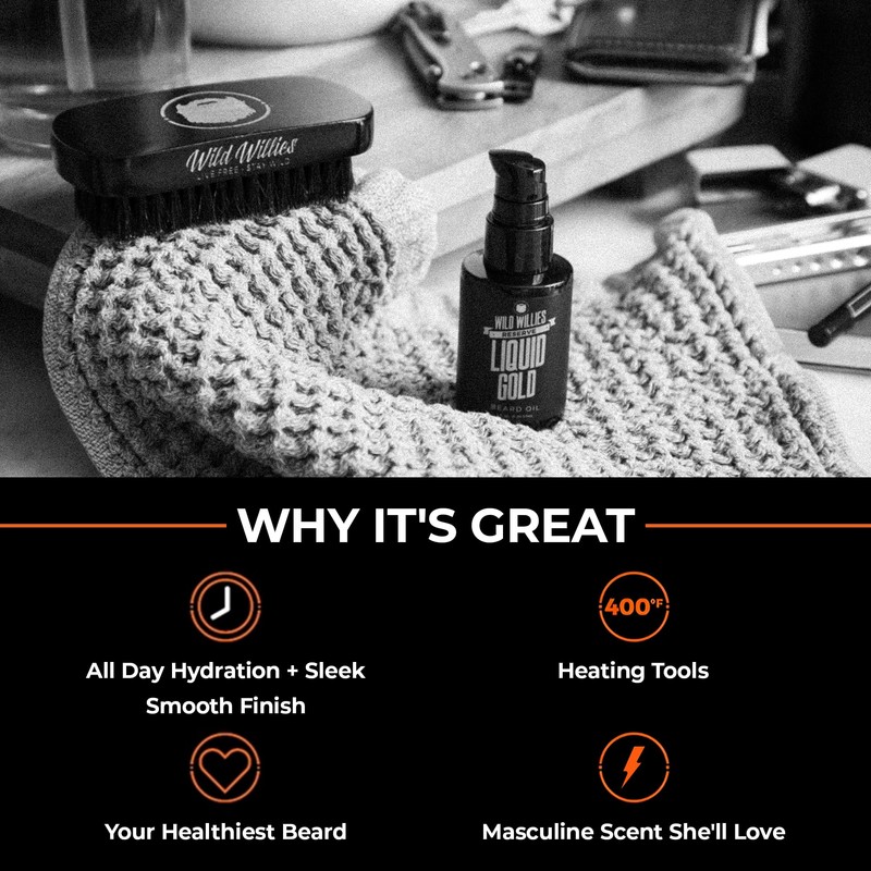 - Refine Your Wild: Step up your grooming routine with Wild Willies Liquid Gold Beard Oil. This silicone-based, premium oil softens, smoothens, and moisturizes, giving your beard a refined and polished look that stands out. It absorbs quickly to provide deep hydration without leaving a greasy residue. Perfect for men who demand high performance and noticeable results. One 2 fl oz bottle.