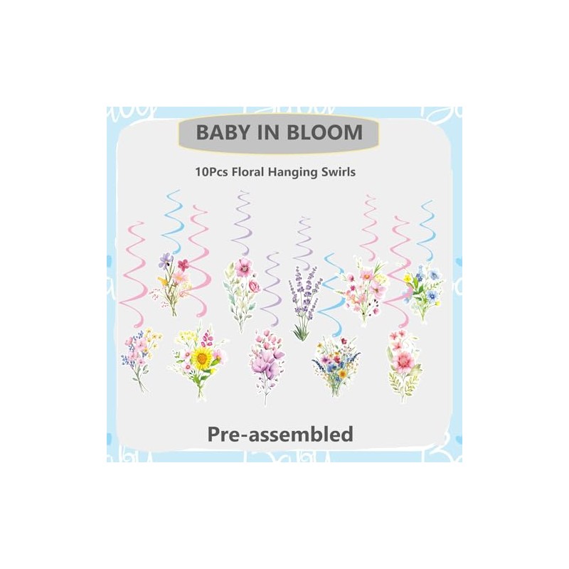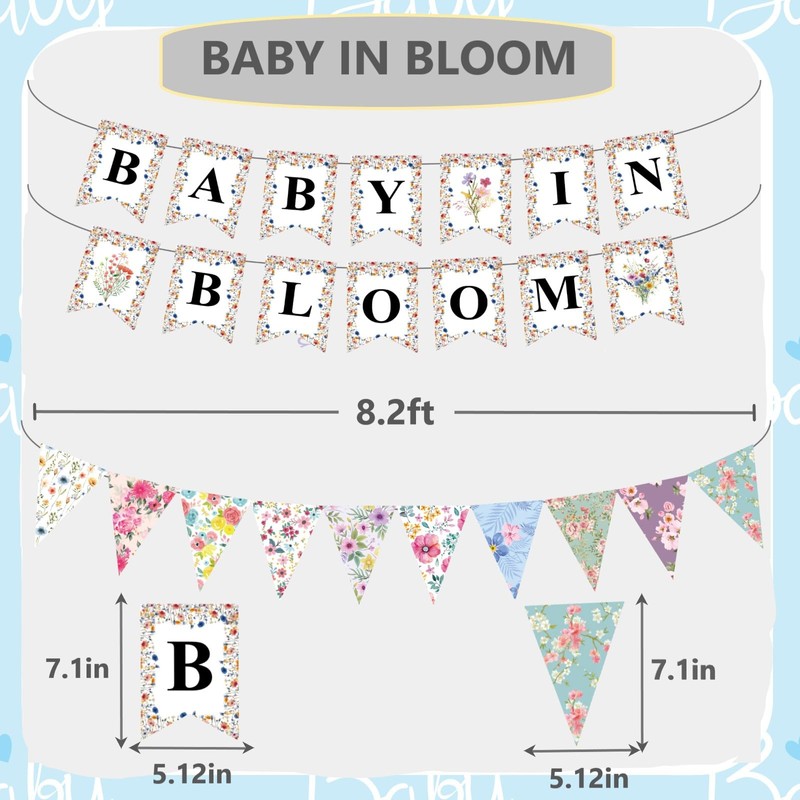 - Package: 1pc BABY IN BLOOM baby shower banner,1pc triangle pennant floral banner, 10pcs hanging swirls with 10pcs wildflower cutouts