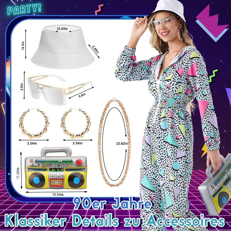 - Includes 6 pieces: jumpsuit jumpsuit hoodie x1, inflatable ghetto blaster x1, fishing hat x1, glasses x1, necklace x1, earrings x1. The accessories are all in retro style, full of nostalgic elements from the 80s 90s, which significantly increases the fun and integrity of the overall picture. The design of each accessory has been carefully selected to ensure a perfect match with the jumpsuit, making you the centre of attention on any occasion