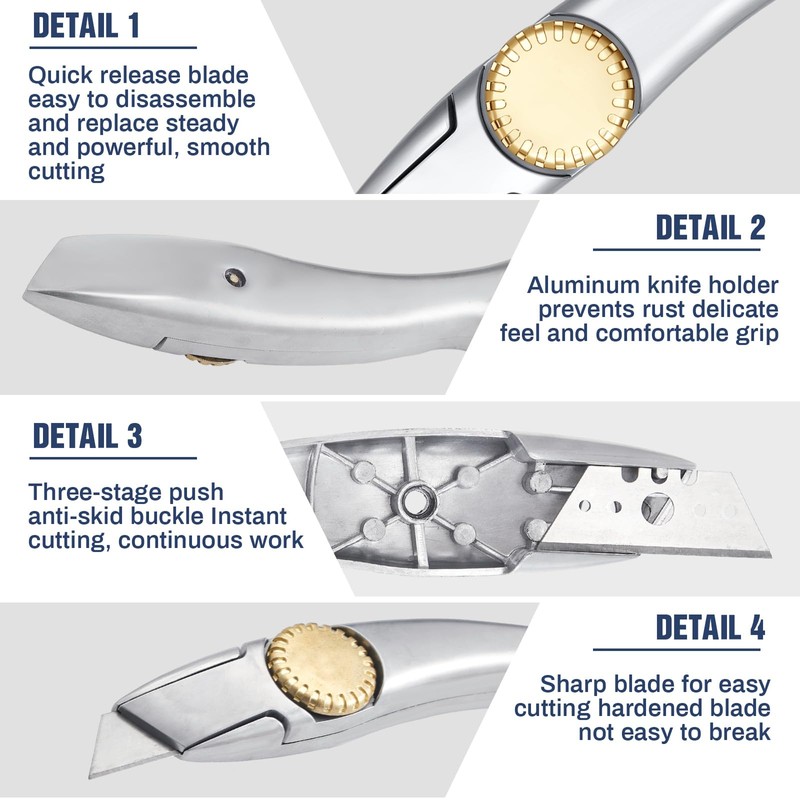 - Screw Lock Design Ensures Safety: each knife for roofing features a secure screw lock design; This makes for a safe and reliable carpet knife cutter, giving you peace of mind while working on your projects; Enjoy a roofing utility knife that values your safety and prevents accidents