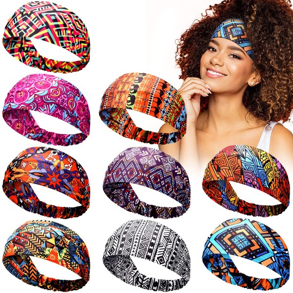 WILLBOND 9 Pieces African Headbands Stretchy Boho Print Hairband Yoga Running Sports Workout Head Grip Band Elastic Turban for Women Girls Hair Accessories (Chic Pattern)