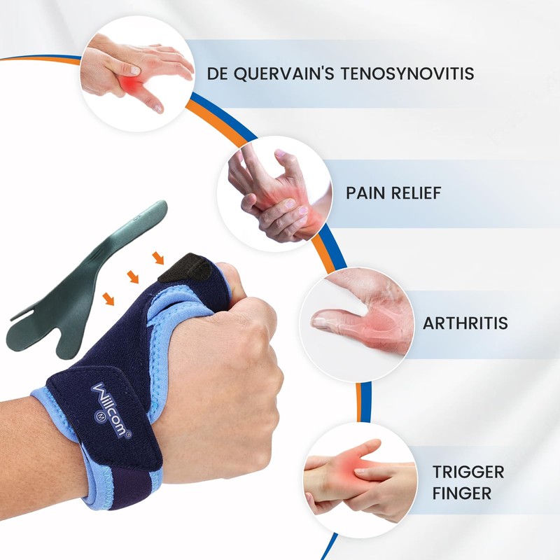 - Thumb Pain Relief: The Willcom Thumb Brace provides comprehensive wrapping and stabilization for the first metacarpophalangeal joint and the base of the thumb. It effectively alleviates pain, soreness, and swelling caused by conditions such as CMC arthritis, tendonitis, thumb sprain, trigger thumb, repetitive strain injuries, and carpal tunnel syndrome.