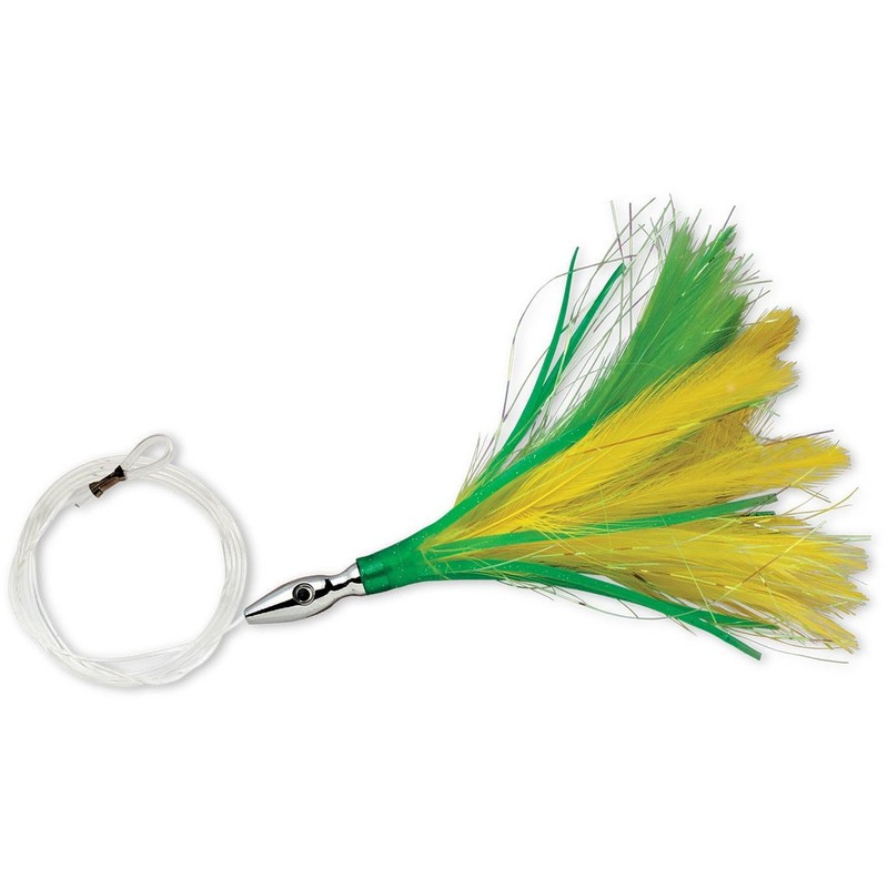 Trolls to 7 knots. Feather design appeals to all baitfish: bonito, mackerel, bluefish, small dorado and small tuna. Pre-rigged