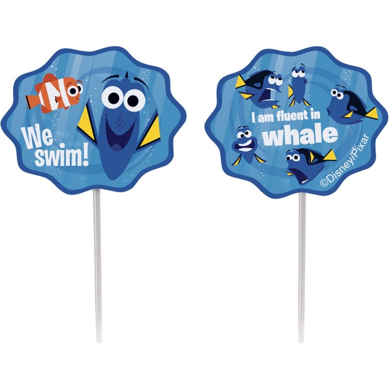 There’s no easier way to decorate themed cupcakes than with Fun Pix featuring Disney Pixar’s Finding Dory. Double-sided cupcake toppers feature two messages. Front features “We swim!” message with Dory and Nemo and back features “I am fluent in whale” alongside a school of tang fish friends. Includes 24 cupcake toppers.