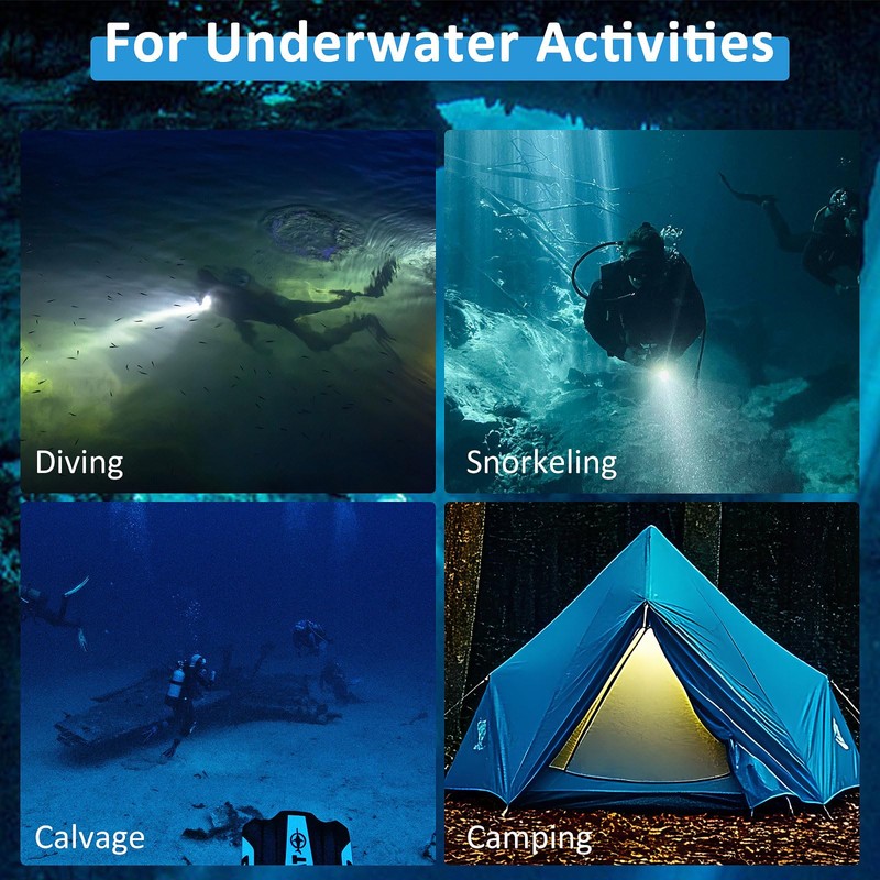 - 4 Lighting Modes – This diving light has 4 lighting modes (High-Medium-Low-SOS) to suit different lighting needs. The high brightness mode can cut through murky water and darkness to provide clear visibility for night dives. Power indicator function prompts remaining battery level: Blue light>20% , red light<20%.