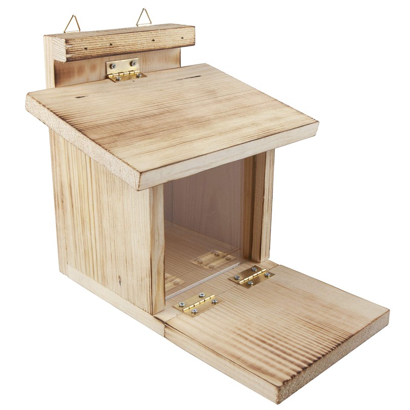 - Made of natural wood – the wooden house has a large window for feeding level control