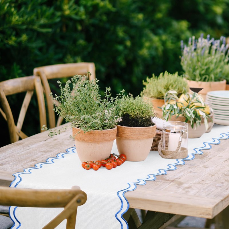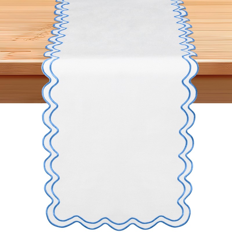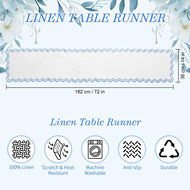 Windkream 72 Inches Scalloped Edge Table Runner, Double Linen Fabric Table Runner Outdoor, Rustic Dining Decor for House Kitchen Coffee (Sky Blue,White)